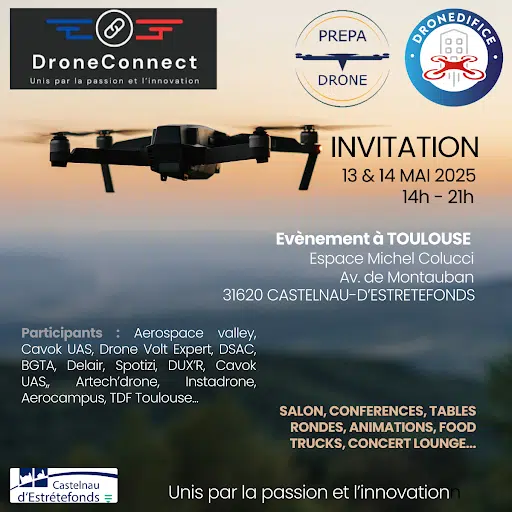 Que vous soyez passionné, professionnel ou simplement curieux, ouvrez grand les yeux : le salon Drone Connect 2025 vous attend les 13 et 14 mai à Castelnau d’Estrétefonds, à deux pas de Toulouse ! Organisé par Prépa Drone et DronEdifice, ce rendez-vous 100% gratuit vous plonge au cœur de l’univers du drone dans une ambiance conviviale, festive et pleine de passion.